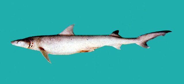 型態特徵:體細而延長。頭平扁,尾鰭前具凹窪。吻中長,吻端背視如圓弧形。眼橢圓形,具瞬膜。前鼻瓣如短葉片狀。鰓裂短,長度為眼徑之1.1-1.3倍。口裂呈弧狀,很短;唇溝一般長;上頜齒側扁之角形,齒頭外斜,外緣具4-7小齒尖,正中具一尖直小齒;下頜前部齒細尖,矛狀,邊緣光滑,不具小齒尖,後部齒外斜,外緣凹缺下具一小齒尖,口閉時下頜齒不明顯突出。噴水孔微小。背鰭2個,形狀相同,第二背鰭較小;前緣圓凸,後緣深凹,上角鈍尖,下角延長尖突;第一背鰭起點在胸鰭內角之上方或稍後;第二背鰭起點在臀鰭之前;腹、臀鰭皆較第二背鰭小;胸鰭等大或略大於第一背鰭,略呈鐮刀狀;尾鰭狹長,稍大於頭長,上葉近尾端,下葉前部尖三角形突出,中部較低平,與後部間有一深缺刻,後部小三角形突出,尾端鈍尖。體側灰褐色,腹面淡白;第一、第二背鰭後緣及尾鰭後端暗褐色。