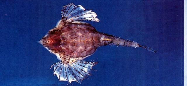 型態特徵:體縱扁而寬,完全被覆堅硬骨板,包括背部側3節、腹部側4節以及可移動之尾環8或9節;最後尾環背面具棘。枕部具2凹窩。眼上骨突出,眼間隔凹入;由腹面可見眼晴。吻部之腹面較背面寬大,稜脊具鋸齒狀。無肛門乳突。背鰭位於體後,與臀鰭相對,無硬棘,僅具5軟條;胸鰭大形,呈水平翼狀,具透明鰭膜以及9-12不分枝軟條;腹鰭具I棘,第一軟條延長呈觸手狀。體色多變,通常淡褐至深褐色,背部和側邊顏色深於腹面;胸鰭具縱列斑點;尾鰭亦具數列黑色斑點。