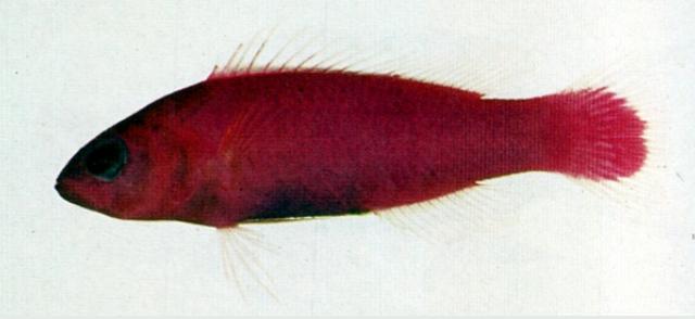 型態特徵:體細長而側扁;頭呈鈍圓形。吻短。眼大。口中大;上下頜齒數列,部分為犬齒;鋤骨及顎骨均具齒。體被小櫛鱗,主鰓蓋骨具鱗;側線截成兩列,前段延伸至背鰭基底中部後,鱗孔數21-25,後段延伸於尾柄中央,鱗孔數7-10。背鰭基底長,具硬棘III,軟條21-22;臀鰭具硬棘II,軟條11-12;腹鰭具I硬棘及5軟條,其中第3根最長;胸鰭鈍圓;尾鰭為截形。體及除尾鰭後緣外之各鰭皆一致呈紫紅色,尾鰭後緣為透明狀;眼眶周圍為藍色。