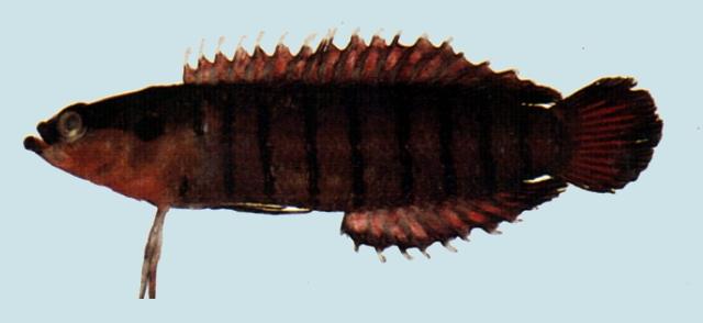 型態特徵:體延長,側扁。頭中大。吻短;唇厚。眼中大。口端位,斜裂;上頜骨向後達眼中央下方。頭部、胸、臀鰭均無鱗,體前半及腹面具圓鱗,從第V背棘基開始,體背及體側均為櫛鱗;具有側線3條,上方側線沿背緣延伸至背鰭基底末端,中央側線由胸鰭基底延伸至尾鰭中央鰭條基底,下方側線由腹鰭硬棘基底沿背緣延伸至臀鰭基底末端,上方側線與中央側線之間的鱗列為7,中央側線與下方側線間的鱗列為6-7。背鰭單一,硬棘部鰭膜間具缺刻,具硬棘XVIII,軟條5;臀鰭具硬棘X,軟條5;胸鰭圓形;腹鰭延長;尾鰭圓形。體呈淡色至褐色,體側具多條黑褐色橫帶,鰓蓋另具一眼斑;頭部上半部褐色,下半部橘褐色。背及臀鰭橘紅色至褐色而具淡色緣;尾鰭橘紅色至褐色而具暗色緣。