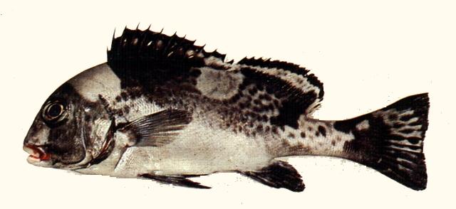 型態特徵:體延長而側扁,背緣隆起呈弧形,腹緣圓。頭中大,背面隆起。吻短鈍而唇厚,隨著成長而腫大。口小,端位,上頜突出於下頜;頜齒呈多行不規則細小尖錐齒。頤部具6孔,但無縱溝亦無鬚。鰓耙細短,第一鰓弓鰓耙數8-13+1+22-26。體被細小弱櫛鱗,側線完全,側線鱗數62-70。背鰭單一,中間缺刻不明顯,無前向棘,硬棘數XII,軟條數18-22;臀鰭基底短,鰭條數III+7;尾鰭略內凹或幾近截平。幼魚和成魚在外觀上差異極大,幼魚時頭部及體側呈乳白色,具黑色眼帶及2條鞍狀斑,背、臀及尾鰭具黑色斑駁;而後慢慢成長至中成魚時,頭部及體側漸呈灰白色,頭部、體側及各鰭漸具黑斑;成魚時頭部及體側呈黃褐色,並密佈黑色小斑點,各鰭具黑色斑點或斑塊。
