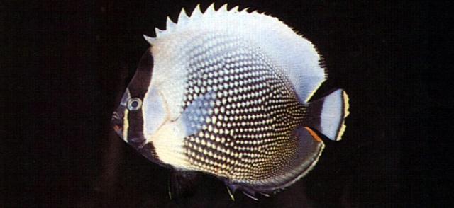 型態特徵:體高而呈卵圓形;頭部上方輪廓平直。吻微尖。前鼻孔具鼻瓣。前鰓蓋緣具細鋸齒;鰓蓋膜與峽部相連。兩頜齒細尖密列,上頜齒10列,下頜齒具12列。體被中型鱗片;側線向上陡昇至背鰭第IX-X棘下方而下降至背鰭基底末緣下方。背鰭單一,硬棘XII,軟條27;臀鰭硬棘III,軟條21。體黑色;體側每一鱗片具一淡色斑,形成約20列斜向後上方的點紋而構成網狀圖案;由背鰭I-III硬棘基部經胸鰭至胸部有一白色寬橫帶;頭部具寬於眼徑之鑲淡黃邊的黑眼帶,向後延伸至腹鰭基部。背鰭灰色,外緣具黑線紋;腹、臀鰭黑色;尾鰭灰色,具黑線紋及黃緣。尾柄黑色。