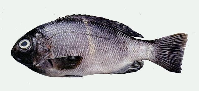 型態特徵:體呈長橢圓形,側扁,頭背微凸。頭短,吻鈍,唇厚。眼中大或小。口小,口裂近水平。上頜骨大部為眶前骨所覆蓋。頜齒前端呈門齒狀,能活動,齒端呈3尖頭;兩側齒細小,呈圓錐狀;鋤骨、顎骨和舌上皆無齒。體被中大櫛鱗,不易脫落;吻部無鱗,主鰓蓋完全覆蓋細鱗,背鰭、臀鰭具鱗鞘;側線完全,與背緣平行,側線鱗數56-59。背鰭硬棘XIV,軟條12-14;臀鰭硬棘III,軟條11;尾鰭末端凹入,上下葉鈍;鰓耙數36-40。體一致為灰褐色至暗褐色,體側具1黃橫帶,成魚有時不顯;主鰓蓋後緣不具黑邊;胸鰭基部有暗褐色斑。