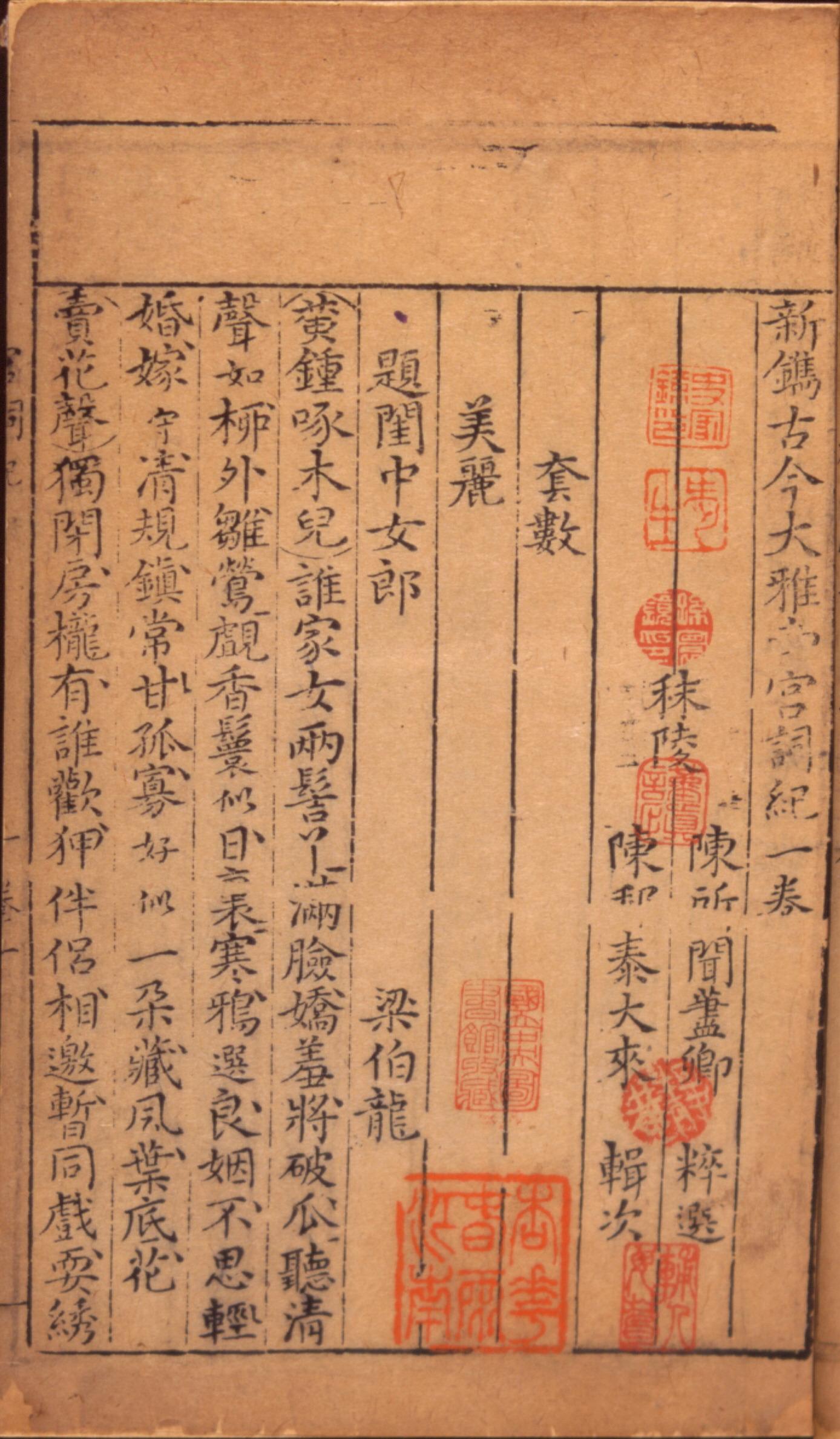 (明)陳所聞(1553)。[新鐫古今大雅北宮詞紀]。《數位典藏與數位學習聯合目錄》。http://catalog.digitalarchives.tw/item/00/08/4d/f1.html(2025/01/16瀏覽)。