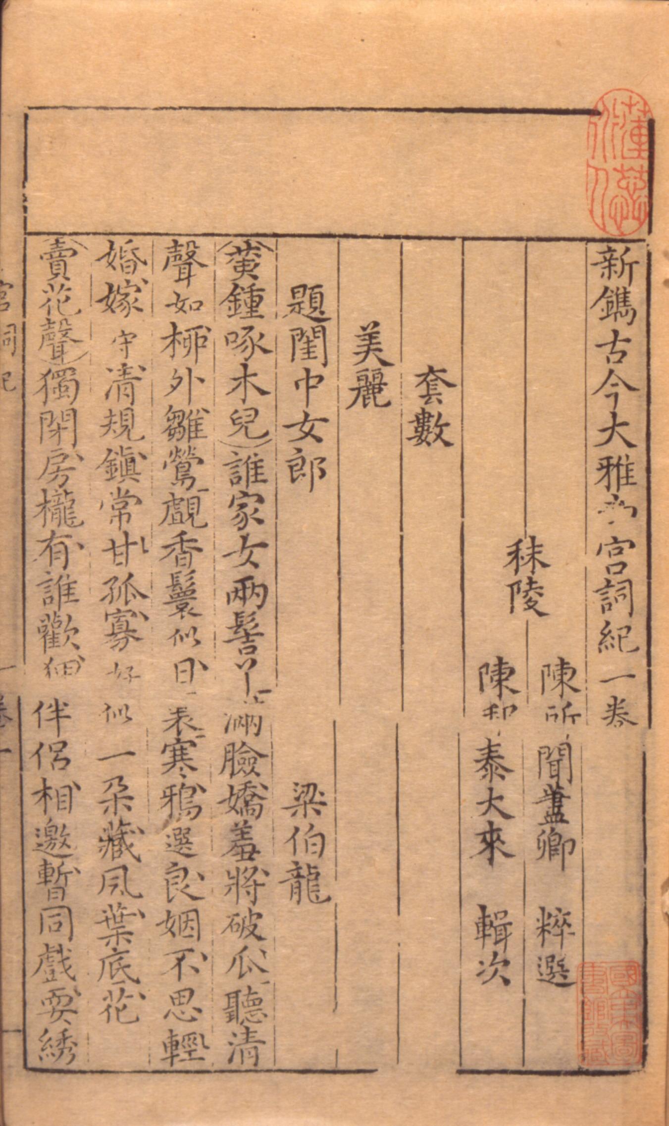 (明)陳所聞(1553)。[新鐫古今大雅南宮詞紀]。《數位典藏與數位學習聯合目錄》。http://catalog.digitalarchives.tw/item/00/08/4d/f2.html(2025/01/16瀏覽)。