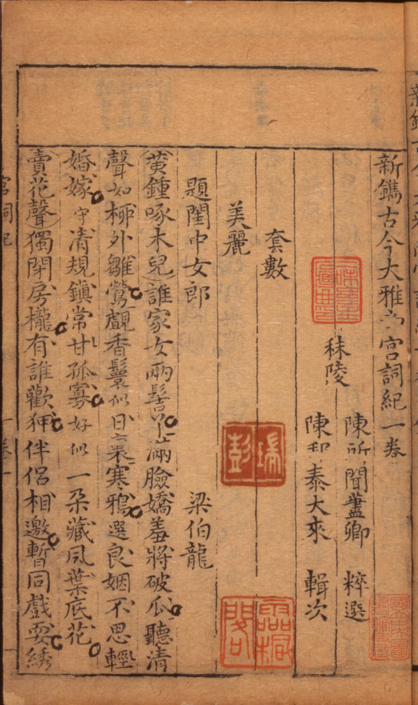 (明)陳所聞(1553)。[新鐫古今大雅南宮詞紀]。《數位典藏與數位學習聯合目錄》。http://catalog.digitalarchives.tw/item/00/08/4d/f3.html(2025/01/16瀏覽)。