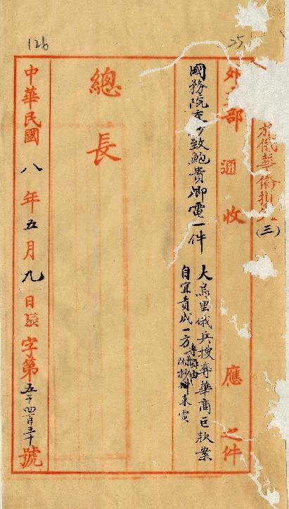 國務院(民國08年05月)。[件名:大烏里俄兵搜奪華商巨款案自宜責成一方專辦]。《數位典藏與數位學習聯合目錄》。http://catalog.digitalarchives.tw/item/00/0a/20/92.html(2025/05/20瀏覽)。