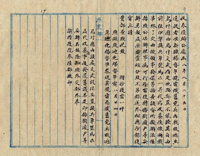 參陸辦公處(民國08年08月)。[件名:安置新省俄舊黨逃兵事並送復楊督軍電由]。《數位典藏與數位學習聯合目錄》。http://catalog.digitalarchives.tw/item/00/0a/2e/97.html(2025/05/20瀏覽)。