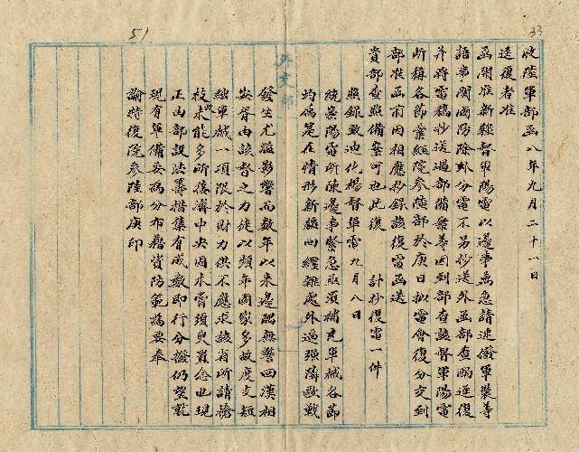 陸軍部(民國08年09月)。[件名:新督電請速撥軍裝事抄錄復電請查照備案由]。《數位典藏與數位學習聯合目錄》。http://catalog.digitalarchives.tw/item/00/0a/2e/af.html(2025/05/20瀏覽)。