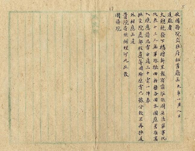 府秘書廳(民國09年01月)。[件名:英法軍事代表回國事]。《數位典藏與數位學習聯合目錄》。http://catalog.digitalarchives.tw/item/00/0a/2e/f1.html(2025/05/20瀏覽)。