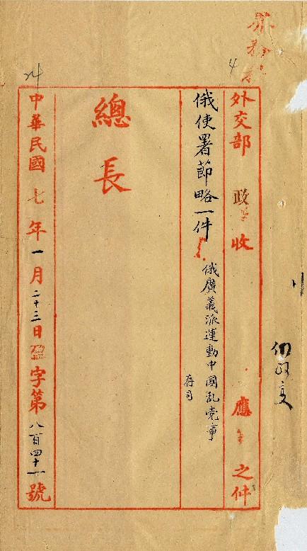 俄使署(民國07年01月)。[件名:防範俄廣義派運動中國亂黨事已電飭駐華各俄領援助中國地方官]。《數位典藏與數位學習聯合目錄》。http://catalog.digitalarchives.tw/item/00/0a/2f/28.html(2025/05/20瀏覽)。
