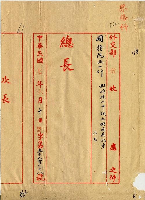 國務院(民國07年06月)。[件名:楊省長電陳對待俄敗兵難民辦法希查照由]。《數位典藏與數位學習聯合目錄》。http://catalog.digitalarchives.tw/item/00/0a/2f/7d.html(2025/05/20瀏覽)。