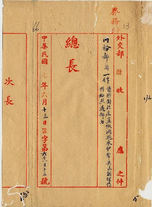 內務部(民國07年06月)。[件名:請將對于處置俄國逃來伊犁兵民辦理情形者知照過部由]。《數位典藏與數位學習聯合目錄》。http://catalog.digitalarchives.tw/item/00/0a/2f/7e.html(2025/05/20瀏覽)。
