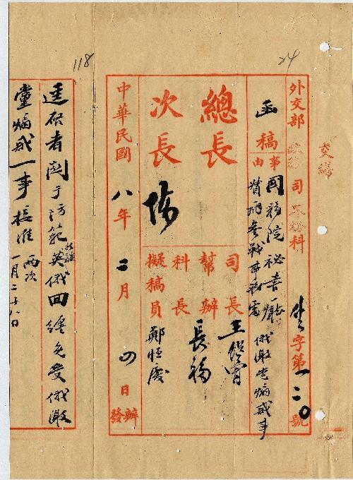 外交部(民國08年02月)。[件名:俄黨事已撥來電照會美俄兩使由]。《數位典藏與數位學習聯合目錄》。http://catalog.digitalarchives.tw/item/00/0a/30/68.html(2025/05/20瀏覽)。