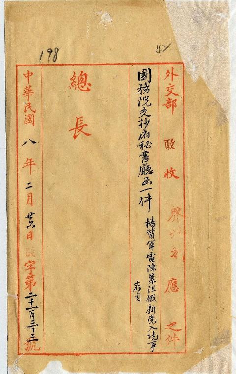 總統府秘書廳(民國08年02月)。[件名:新督電陳禁阻俄新黨入境由]。《數位典藏與數位學習聯合目錄》。http://catalog.digitalarchives.tw/item/00/0a/30/7a.html(2025/05/20瀏覽)。