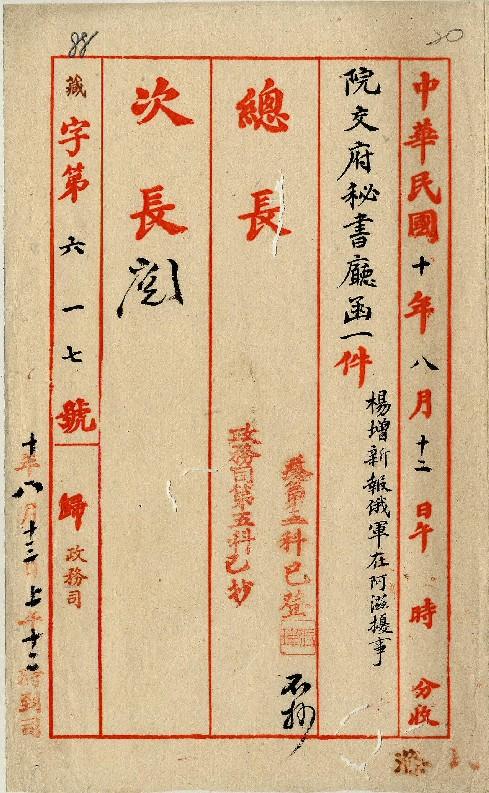 總統府秘書廳(民國10年08月)。[件名:楊增新報俄軍在阿滋擾事]。《數位典藏與數位學習聯合目錄》。http://catalog.digitalarchives.tw/item/00/0a/31/b8.html(2025/05/20瀏覽)。