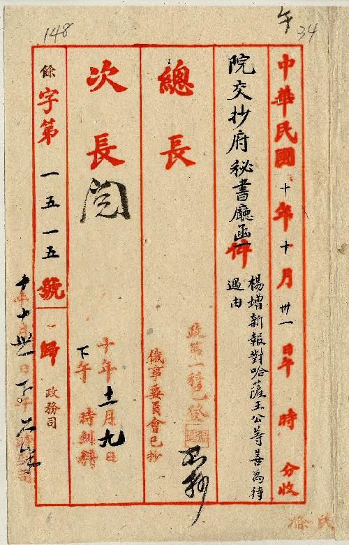 公府秘書廳(民國10年10月)。[件名:楊增新報對哈薩王公等善為待遇由]。《數位典藏與數位學習聯合目錄》。http://catalog.digitalarchives.tw/item/00/0a/31/c6.html(2025/05/20瀏覽)。