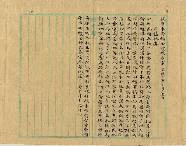 庫車回纏全體代表(民國13年10月)。[件名:馬福興案]。《數位典藏與數位學習聯合目錄》。http://catalog.digitalarchives.tw/item/00/0a/32/3b.html(2025/05/20瀏覽)。