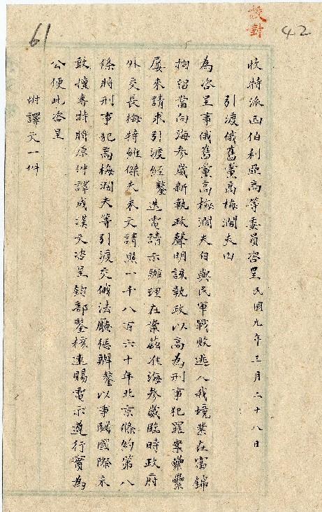 特派西伯利亞高等委員(民國09年03月)。[件名:引渡俄舊黨高梅闊夫]。《數位典藏與數位學習聯合目錄》。http://catalog.digitalarchives.tw/item/00/0a/32/ad.html(2025/05/20瀏覽)。