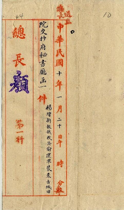 總統府秘書廳(民國10年01月)。[件名:楊增新報俄敗兵偷運軍裝來古城由]。《數位典藏與數位學習聯合目錄》。http://catalog.digitalarchives.tw/item/00/0a/34/08.html(2025/05/20瀏覽)。