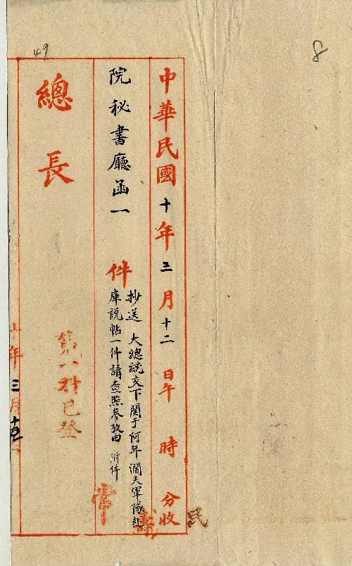 院秘書廳(民國10年03月)。[件名:抄送大總統交下關于阿年闊夫軍隊赴庫說帖一件請查照參考]。《數位典藏與數位學習聯合目錄》。http://catalog.digitalarchives.tw/item/00/0a/34/1e.html(2025/05/20瀏覽)。