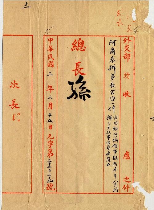 署阿爾泰辦事長官(民國03年02月)。[件名:咨照駐阿俄領事擬於本年八月開辦司牙孜事請查覆由]。《數位典藏與數位學習聯合目錄》。http://catalog.digitalarchives.tw/item/00/0a/34/f9.html(2025/05/20瀏覽)。