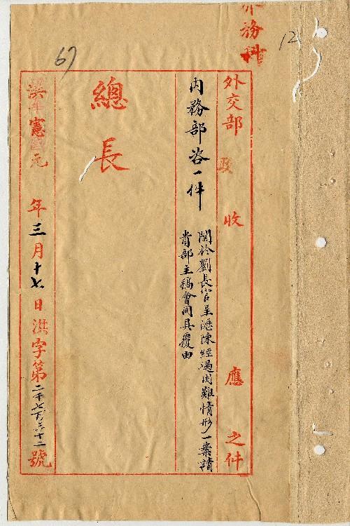 內務部(洪憲01年03月)。[件名:關於劉長官呈瀝陳經過困難情形一案請貴部主稿會同具復]。《數位典藏與數位學習聯合目錄》。http://catalog.digitalarchives.tw/item/00/0a/35/56.html(2025/05/20瀏覽)。