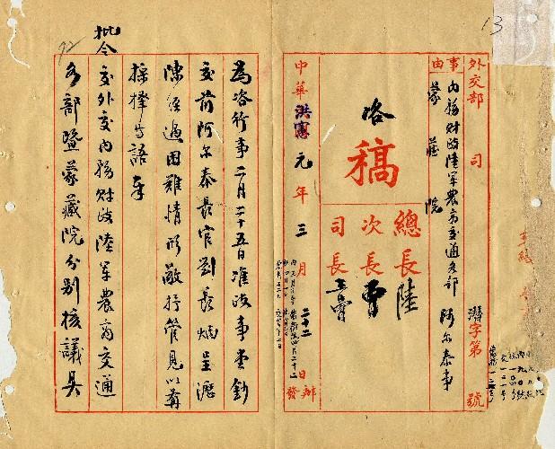 外交部(洪憲01年03月)。[件名:阿爾泰劉長官呈瀝陳經過困難情形一案本部擬就呈稿咨送查照希署名送還]。《數位典藏與數位學習聯合目錄》。http://catalog.digitalarchives.tw/item/00/0a/35/57.html(2025/05/20瀏覽)。