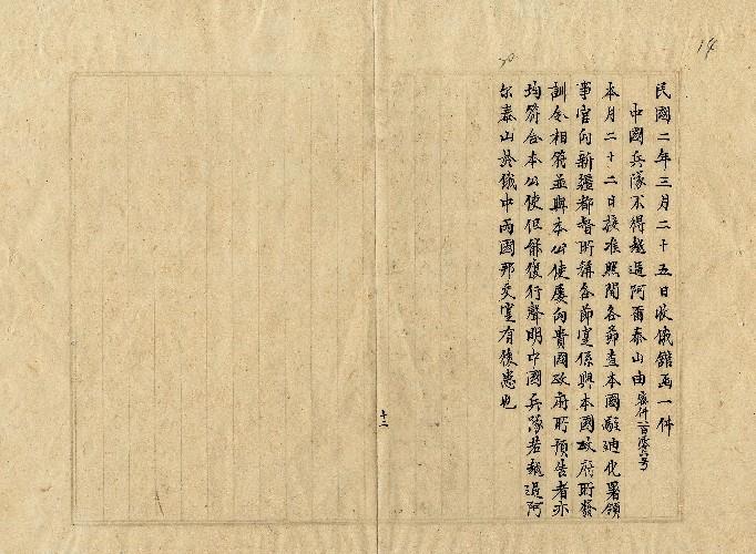 俄館(民國02年03月)。[件名:中國兵隊不得越過阿爾泰山]。《數位典藏與數位學習聯合目錄》。http://catalog.digitalarchives.tw/item/00/0a/35/8d.html(2025/05/20瀏覽)。