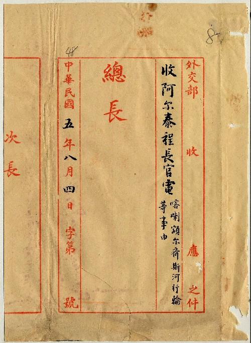 阿爾泰程長官(民國05年08月)。[件名:喀喇額爾齊斯河行輪等事]。《數位典藏與數位學習聯合目錄》。http://catalog.digitalarchives.tw/item/00/0a/35/f8.html(2025/05/20瀏覽)。