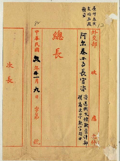 阿爾泰辦事長官(民國06年01月)。[件名:咨送俄文條款並請部磋商更正丁款字句由]。《數位典藏與數位學習聯合目錄》。http://catalog.digitalarchives.tw/item/00/0a/35/fc.html(2025/05/20瀏覽)。