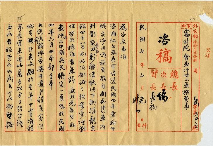 外交部(民國07年07月)。[件名:會查沖呼爾案旅費事咨復查照由]。《數位典藏與數位學習聯合目錄》。http://catalog.digitalarchives.tw/item/00/0a/36/50.html(2025/05/20瀏覽)。