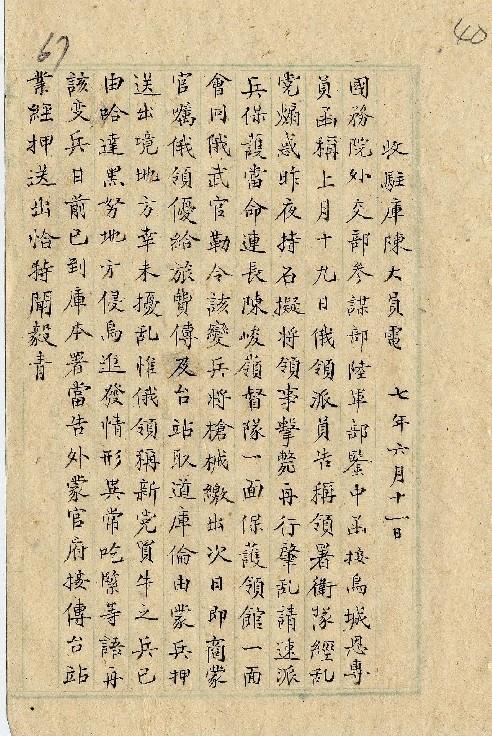 駐庫陳大員(民國07年06月)。[件名:俄領館衛隊及新黨兵事]。《數位典藏與數位學習聯合目錄》。http://catalog.digitalarchives.tw/item/00/0a/37/9b.html(2025/05/20瀏覽)。