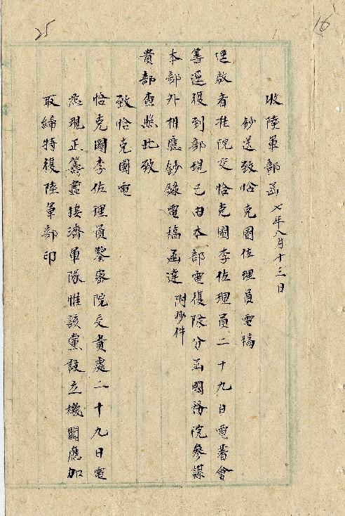 陸軍部(民國07年08月)。[件名:鈔送至恰克圖佐理員電稿]。《數位典藏與數位學習聯合目錄》。http://catalog.digitalarchives.tw/item/00/0a/37/bf.html(2025/05/20瀏覽)。