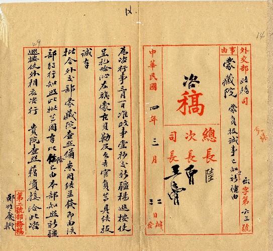 外交部(民國04年03月)。[件名:准政事堂抄交批令咨行查照藉資接洽]。《數位典藏與數位學習聯合目錄》。http://catalog.digitalarchives.tw/item/00/0a/38/53.html(2025/05/20瀏覽)。