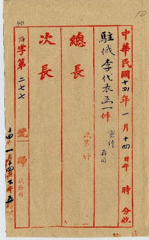 駐俄李代表(民國14年01月)。[件名:籲請部長責成新督出兵唐努烏梁海以維國權]。《數位典藏與數位學習聯合目錄》。http://catalog.digitalarchives.tw/item/00/0a/38/73.html(2025/05/20瀏覽)。