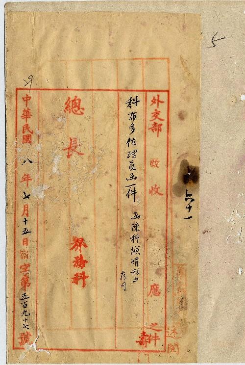 科布多佐理員(民國08年07月)。[件名:函陳科布城情形]。《數位典藏與數位學習聯合目錄》。http://catalog.digitalarchives.tw/item/00/0a/38/ff.html(2025/05/20瀏覽)。