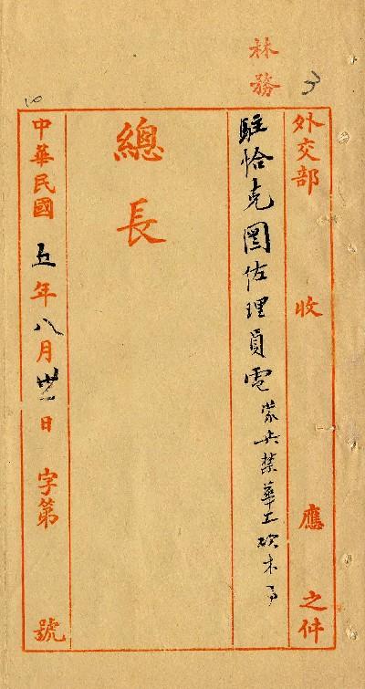 駐恰克圖佐理員(民國05年08月)。[件名:蒙兵禁華工砍木事]。《數位典藏與數位學習聯合目錄》。http://catalog.digitalarchives.tw/item/00/0a/39/90.html(2025/05/20瀏覽)。