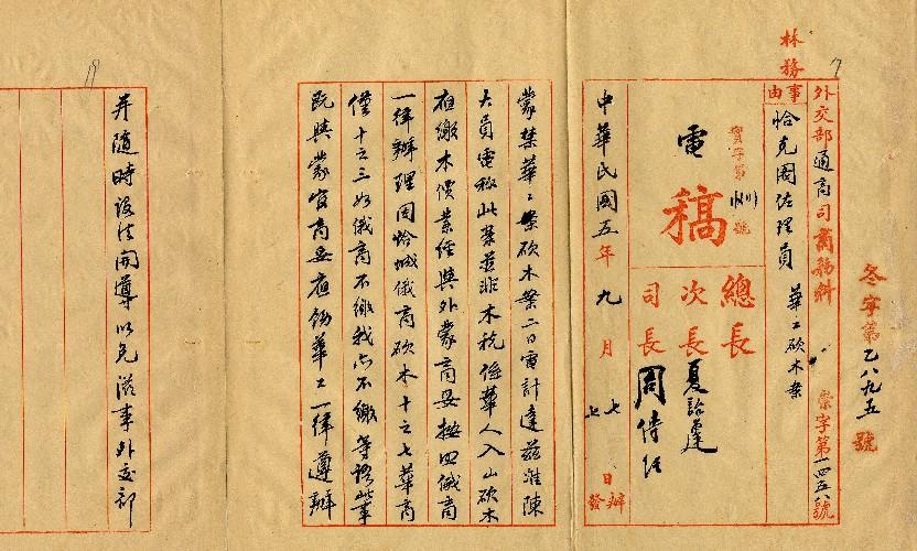 外交部(民國05年09月)。[件名:華工砍木案]。《數位典藏與數位學習聯合目錄》。http://catalog.digitalarchives.tw/item/00/0a/39/94.html(2025/05/20瀏覽)。
