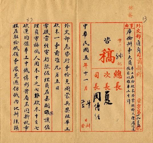外交部(民國05年11月)。[件名:華工在恰砍木外蒙擬增木價應從速磋商以確華工生計]。《數位典藏與數位學習聯合目錄》。http://catalog.digitalarchives.tw/item/00/0a/39/9a.html(2025/05/20瀏覽)。