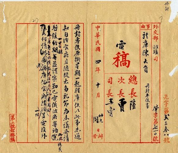 外交部(民國04年10月)。[件名:冊封事希速與庫倫官府接洽]。《數位典藏與數位學習聯合目錄》。http://catalog.digitalarchives.tw/item/00/0a/39/d1.html(2025/05/20瀏覽)。