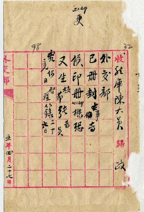 駐庫陳大員(民國05年04月)。[件名:冊封事專候印冊張專員何日起程]。《數位典藏與數位學習聯合目錄》。http://catalog.digitalarchives.tw/item/00/0a/39/e9.html(2025/05/20瀏覽)。