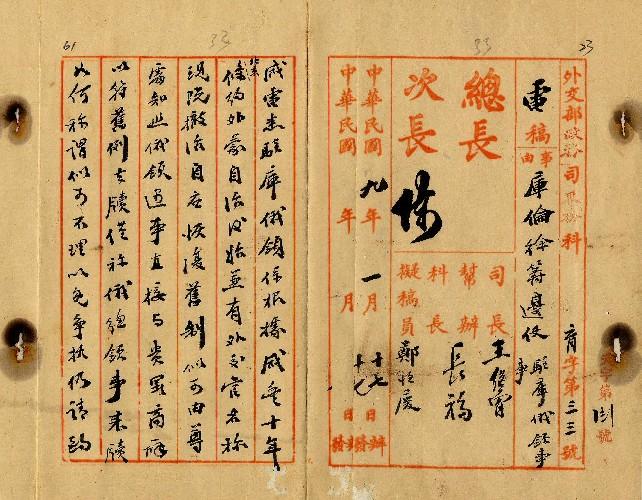 外交部(民國09年01月)。[件名:復咸電駐庫俄領撤治後應恢復舊制不得兼有外交官名稱]。《數位典藏與數位學習聯合目錄》。http://catalog.digitalarchives.tw/item/00/0a/3a/3f.html(2025/05/20瀏覽)。
