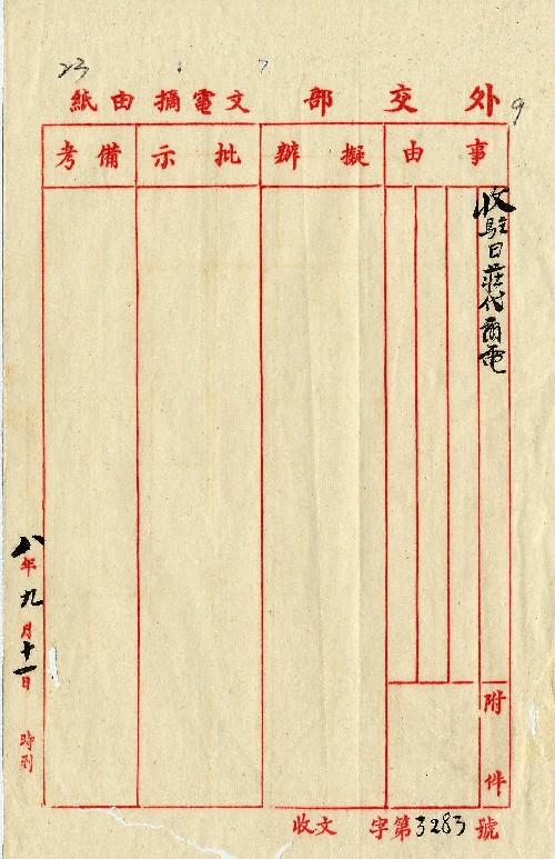 駐日莊代辦(民國08年09月)。[件名:電復帕王病狀]。《數位典藏與數位學習聯合目錄》。http://catalog.digitalarchives.tw/item/00/0a/3a/50.html(2025/05/20瀏覽)。