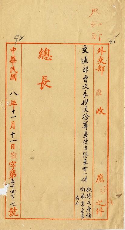 徐籌邊使(民國08年11月)。[件名:來京喇嘛在張行蹤詭密已派張參事沿途照拂喇嘛來京]。《數位典藏與數位學習聯合目錄》。http://catalog.digitalarchives.tw/item/00/0a/3a/69.html(2025/05/20瀏覽)。