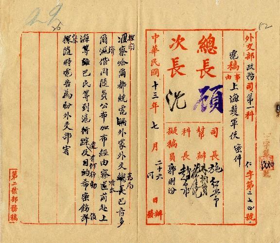 外交部(民國13年07月)。[件名:請密查蒙總長巴氏抵滬行動]。《數位典藏與數位學習聯合目錄》。http://catalog.digitalarchives.tw/item/00/0a/3a/8b.html(2025/05/20瀏覽)。