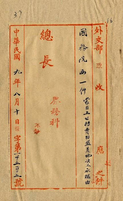 國務院(民國09年08月)。[件名:准色旺扎布等電稱報載熱屬蒙古王公暗將昭盟荒地私賣決不承認等語函送查核]。《數位典藏與數位學習聯合目錄》。http://catalog.digitalarchives.tw/item/00/0a/3a/af.html(2025/05/20瀏覽)。