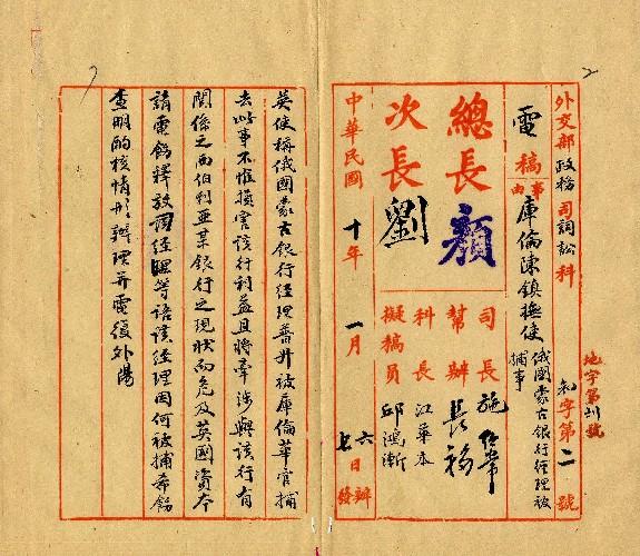 外交部(民國10年01月)。[件名:俄國蒙古銀行經理被捕事]。《數位典藏與數位學習聯合目錄》。http://catalog.digitalarchives.tw/item/00/0a/3b/12.html(2025/05/20瀏覽)。