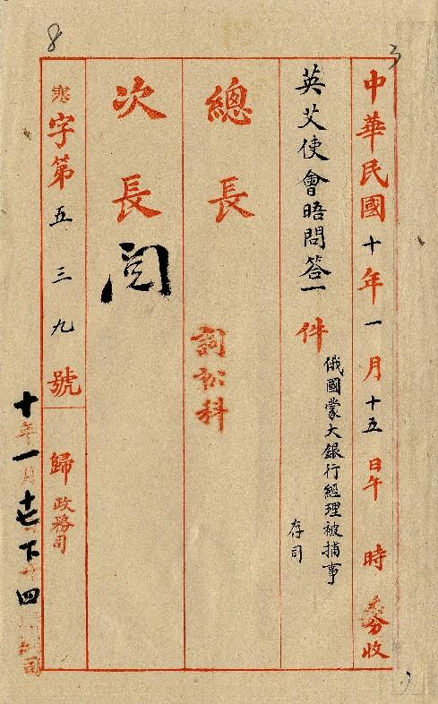作者不詳(民國10年01月)。[件名:俄國蒙大銀行經理被捕事]。《數位典藏與數位學習聯合目錄》。http://catalog.digitalarchives.tw/item/00/0a/3b/13.html(2025/05/20瀏覽)。