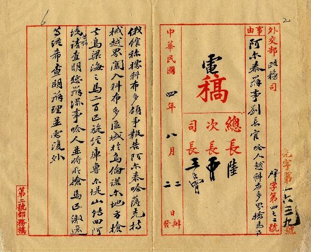 外交部(民國04年08月)。[件名:哈人越科布多界搶馬事希查明電復]。《數位典藏與數位學習聯合目錄》。http://catalog.digitalarchives.tw/item/00/0a/3b/18.html(2025/05/20瀏覽)。